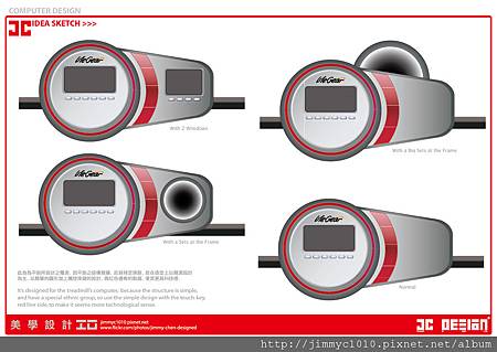 此為為平跑所設計之電表, 因平跑之結構簡單, 且具特定族群, 故在造型上以簡潔設計為主. 以簡單的圓形加上觸控按鍵的設計, 與紅色邊條的點綴, 使其更具科技感.