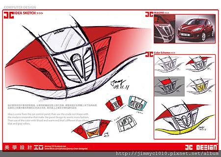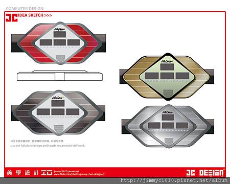 設計靈感來自於車用控制面版, 以車用粗礦造型搭上現代流線, 使面板設計在視覺上多了些時尚感. 在材質上以金屬材質為主, 使面版呈現出一種鋼性美.